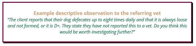 Our non-vet members may be able to identify the potential involvement of some form of medical issue for discussion with the referring vet, but they cannot legally or ethically make a diagnosis. For instance, you can pass on your observations of an animal from a consult to their vet, describing behaviours you think may indicate pain or discomfort, but it is up to the vet to decide what the medical issue is and, indeed, if there is one at all. Sometimes the owner providing brief video footage or a diary to their vet is helpful alongside your observations.