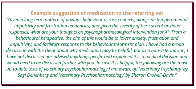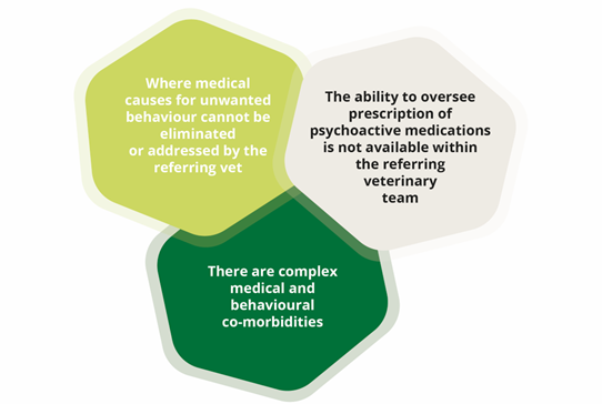 Where medical causes for unwanted behaviour are suspected but cannot be adequately addressed, when a referring vet feels that psychoactive medication may be indicated but does not feel confident to prescribe it without support, and when the animal has a complex medical history, then referral to a veterinary behaviourist is advised. A Veterinary Behaviourist would also be appropriate if there may be polypharmacy involved, or a lack of response to a behaviour treatment plan.